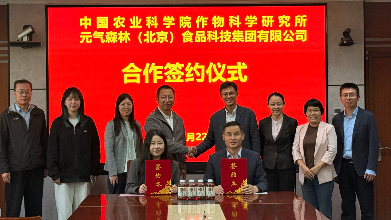04.23作科所与元气森林签署营养饮品种子研发合作协议NEW4月22日,中国农业科学院作物科学研究所与元气森林(北京)食品科技集团有限公司在京签署合作协议。作科所成果转化处处长肖永贵与元气森林“好自在”品牌负责人桑冬雨分别代表双方签约。作科所所长周文彬、元气森...