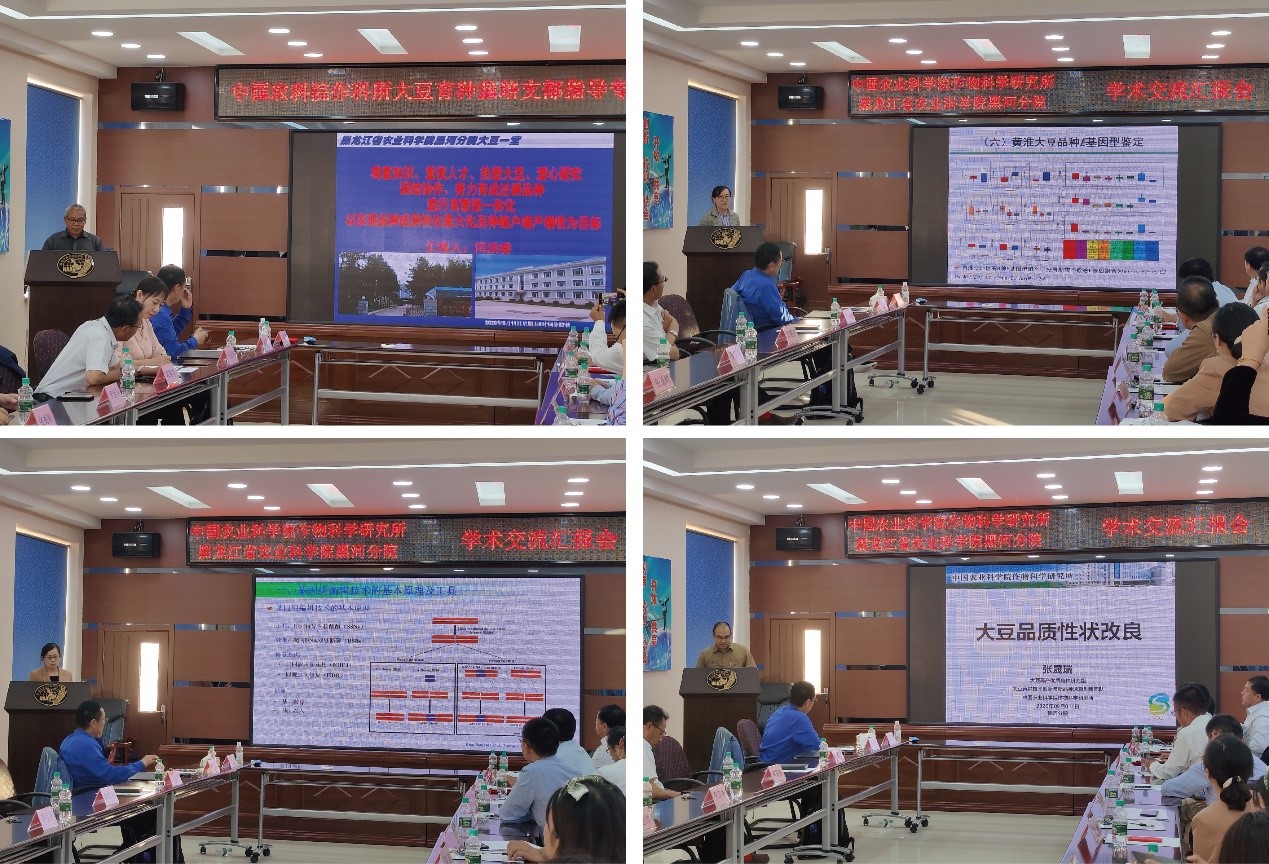双方人员还围绕大豆科研进展进行了学术交流。大豆育种家、黑河分院闫洪睿研究员介绍了黑河分院大豆育种团队在团队建设、人才培养和高寒地区极早熟大豆品种选育方面的经验;作科所青年科技骨干武婷婷博士、陈莉博士、张晟瑞博士分别介绍了大豆光温反应鉴定体系、基因编辑技术应用及大豆品质性状改良方面的进展。“生产实践指导专家”介绍了所在地区的大豆生产情况,表达了与作科所开展大豆新品种、新技术研发及示范推广合作的强烈愿望。
