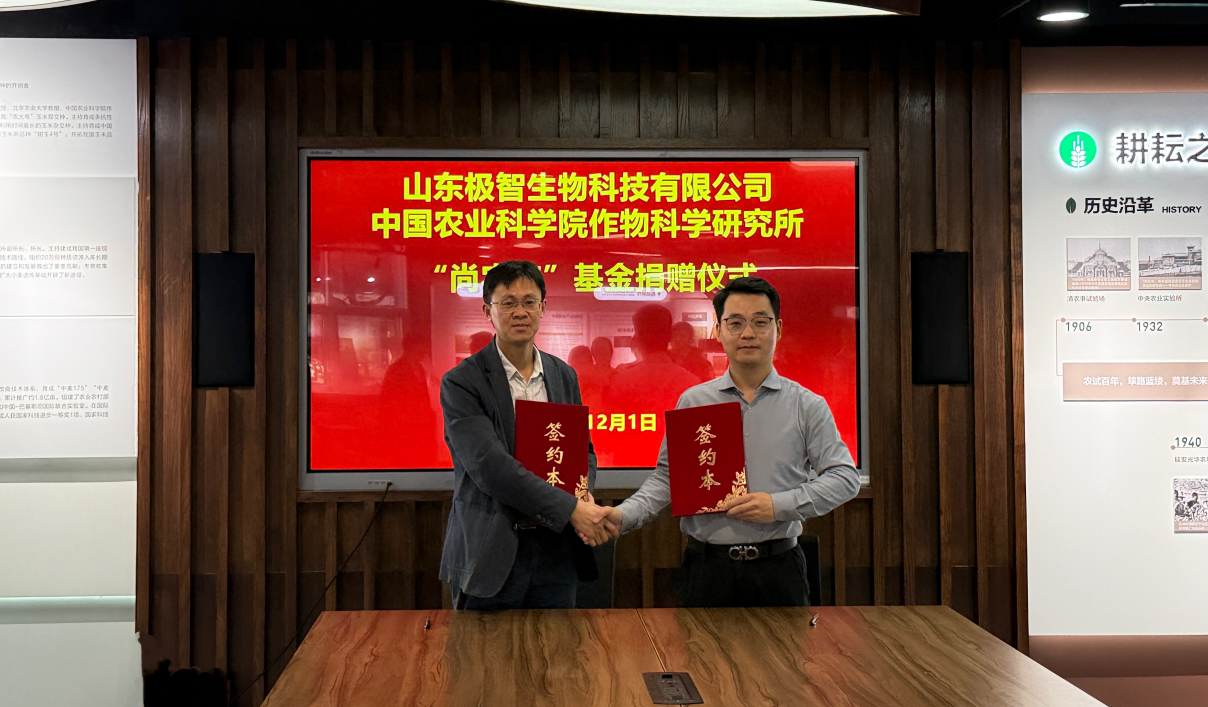 12.05作科所与极智生物举行“尚农奖”基金捐赠签约仪式12月1日,中国农业科学院作物科学研究所与山东极智生物科技有限公司举行“尚农奖”基金捐赠签约仪式。作科所所长周文彬、极智生物公司创始人焦成智分别代表双方签署捐赠协议。双方相关部门负责人及科研骨干代表共...