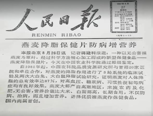 中国农业科学院品种资源研究所(作物科学研究所前身之一)陆大彪教授自1979年起,依托国家作物种质库,对1492份燕麦品种资源进行系统筛选与功能评价,深入开展燕麦降脂成分研究并推动其产业化应用,最终选育出具有显著调节血脂功能的“世壮”牌燕麦专用品种。并于1981 -1986年,历经北京协和医院等18家医院多轮动物实验和临床研究,验证该品种制成的燕麦保健片能有效降低血脂,同时对糖尿病和习惯性便秘等疾病也有显著疗效。1993年,“世壮”牌燕麦保健片获评“国家级新产品”;1997年,取得我国首个燕麦类保健食品批准文号(卫食健字第002号),开创了国内燕麦功能性食品研发与生产的先河。