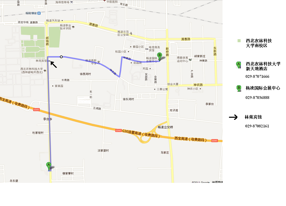 本届研讨会将在西北农林科技大学南校区3号教学楼进行,距该校区最近的宾馆是林苑宾馆,其次为西北农林科技大学新天地酒店(三星级),较远的为杨凌国际会展中心(四星级)。各宾馆的联系方式如图所示。