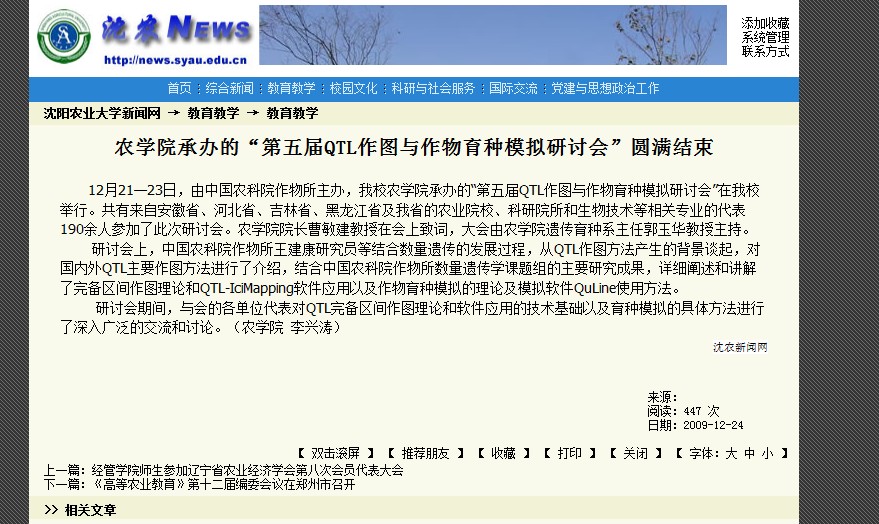 沈阳农业大学与我课题在科研上一直有着密切的合作关系,此次应沈阳农业大学邀请,王建康老师携李慧慧老师及博士生张鲁燕与沈阳农业大学农学院合作于2009年12月21-23日举办了第五届“QTL作图和育种模拟研讨会”,共有来自安徽省、河北省、吉林省、黑龙江省及我省的农业院校、科研院所和生物技术等相关专业的代表190余人参加了此次研讨会。农学院院长曹敏建教授在会上致词,大会由农学院遗传育种系主任郭玉华教授主持。与前四次一样,均受到了广大师生及科研人员的热烈欢迎。