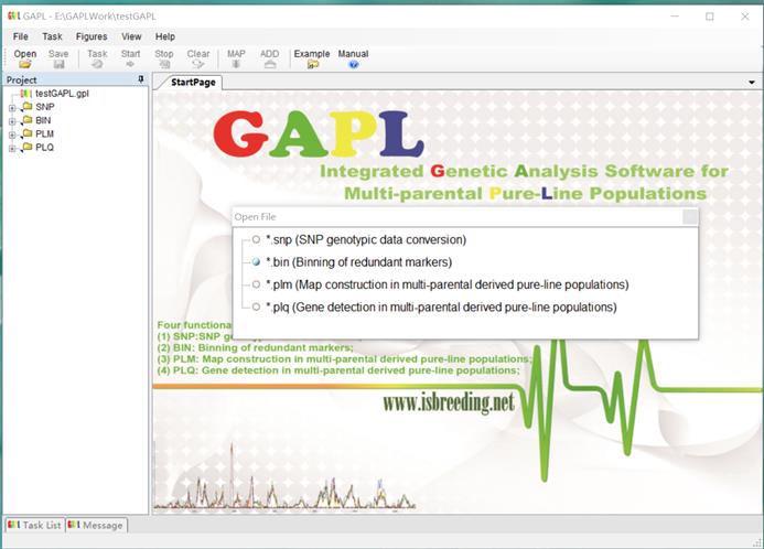 Technical development of GAPL: The software is project based, where kernel modules for building linkage maps were written by C#, those for QTL mapping was written by Fortran 90/95, and the interface was written by C#. It runs on Windows XP/Vista/7/10, with .NET Framework 4.0.