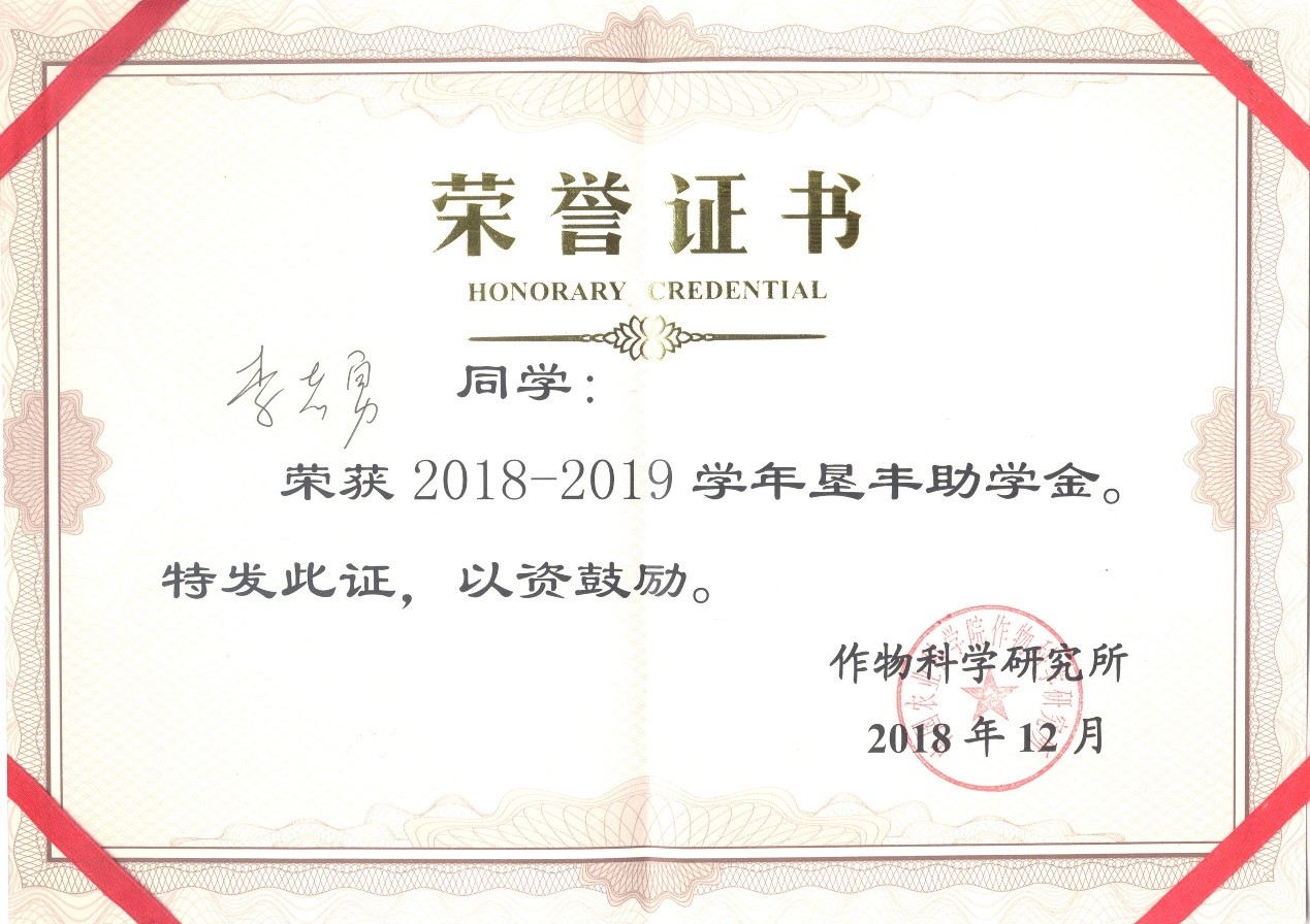 2018年12月24日,课题组硕士研究生李志勇通过答辩评审,获得中国农业科学院作物科学研究所“垦丰助学金”。