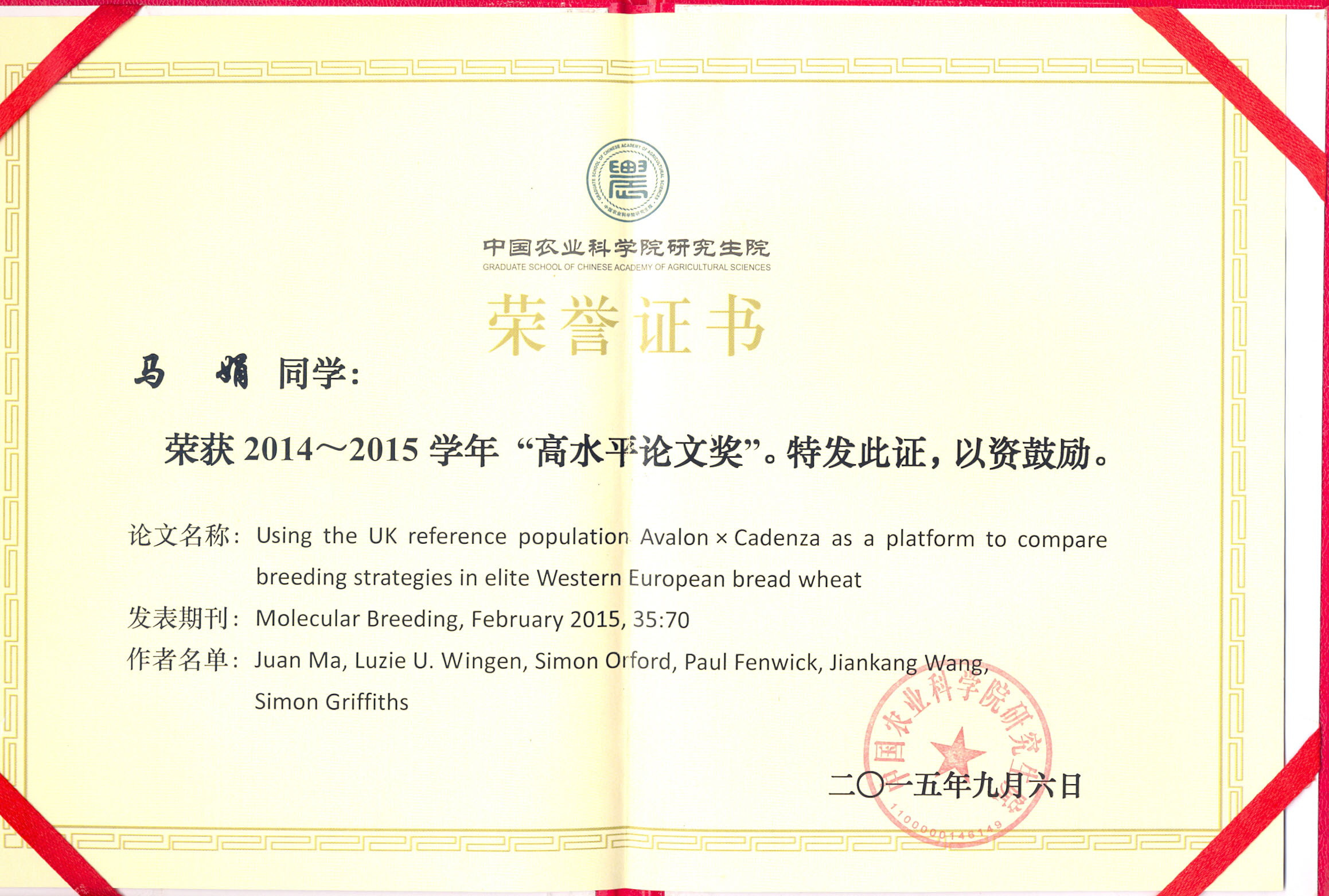2015年9月6日,课题组博士研究生马娟获得我院2014-2015学年“高水平论文奖”。获奖论文题目为“Using the UK reference population Avalon× Cadenza as a platform to compare breeding strategies in elite Western European bread wheat”,该论文发表在国际杂志Molecular breeding。论文研究的主要内容为利用英国小麦Avalon×Cadenza DH遗传参照群体,鉴定产量及产量相关性状基因信息,根据英国小麦产量育种目标要求,设计目标基因型来提高小麦的产量。论文主要结论:通过模拟的方法比较了不同杂交组合,不同育种方案的优劣,得出以DH61×DH182育种亲本能产生较多的目标基因型,F3-DH的方法相比混合选择和修饰SSD(单粒传)在目标基因型个数和产量遗传进度方面均具有较强的优势。文章中推荐的组合和育种方法为英国小麦设计育种实际应用提供理论指导,具有重要的实际价值和意义。