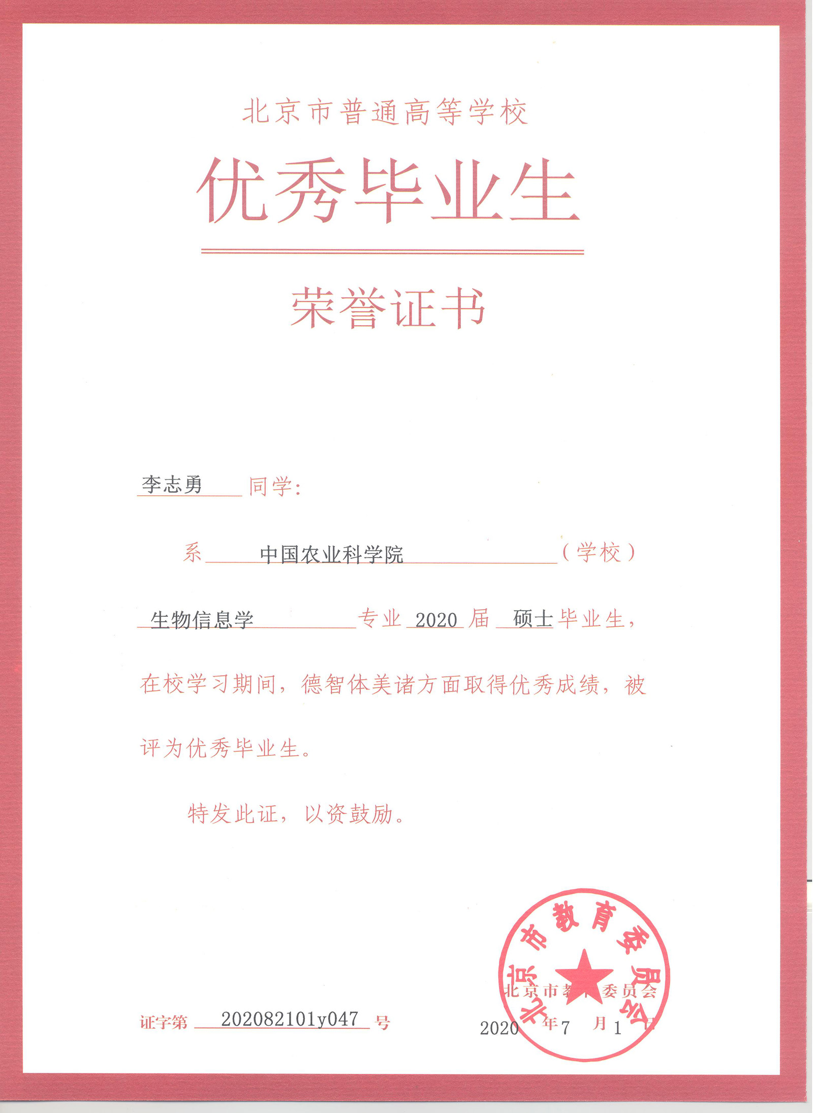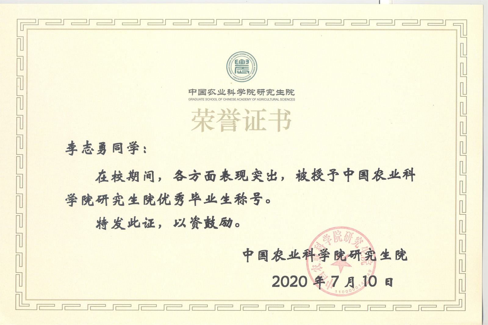 经中国农业科学院研究生院综合评定,我课题组硕士研究生李志勇获得2020年度中国农业科学院优秀毕业生荣誉称号,并通过北京市优秀毕业生评选,同时获得北京市优秀毕业生荣誉称号。