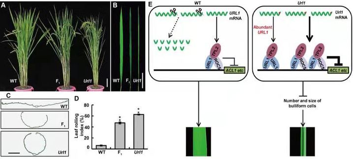 该研究通过诱变粳稻品种日本晴,获得了一份半显性内卷叶突变体Url1,其叶片上表皮泡状细胞数目和面积减少,导致叶片内卷,因而该突变体株型直立,但株高、穗型、育性及籽粒大小均未受到不利影响,适宜在高密度条件下种植。研究人员分离获得了URL1基因,进一步生化分析表明,URL1参与形成转录抑制复合物,直接结合到泡状细胞发育正调控因子ACL1基因启动子上并抑制其表达,从而导致叶片卷曲。这些结果表明URL1在水稻叶形调控中具有重要作用。该项研究有助于构建和完善水稻叶片卷曲分子调控网络,对水稻株型育种具有重要的理论和指导意义。