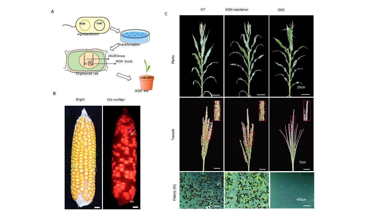 研究人员利用基因编辑技术对玉米育性基因的功能结构域进行了定点定向删除,从而创制了核不育系,并巧妙地利用基因编辑技术精确性使之与保持系技术兼容,从而创制出操控型核不育保持系。