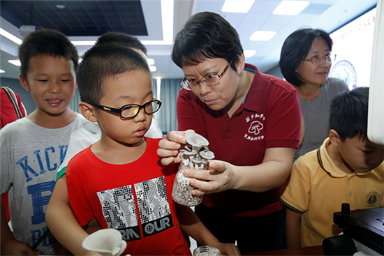 资源区划所,志愿者指导小朋友查看食用菌子实体形态。