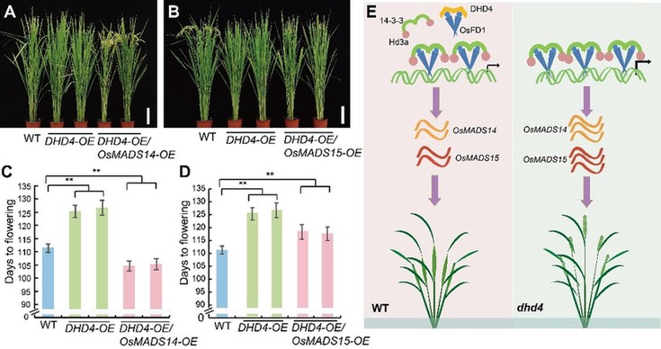 该团队研究人员克隆了一个新的抽穗期微效抑制因子DHD4。研究发现DHD4通过与抽穗期调控蛋白OsFD1的互作,影响成花素激活复合体(FAC复合物)的形成,进而导致开花基因OsMADS14、OsMADS15的表达降低,最终延迟水稻抽穗期。该研究揭示了水稻抽穗期调控的新机制,对指导水稻抽穗期精细调控的分子育种和生产实践具有重要意义。