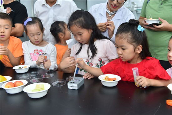 9月21日,在位于北京的农业农村部食物与营养发展研究所,小朋友在做实验测定水果糖度。
