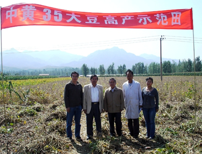 2011年9月23日,中国农业科学院作物科学研究所组织沈阳农业大学董钻教授为组长的专家组对北京市密云县太师屯镇太师庄村农户何宝海种植的中黄35大豆田进行现场测产验收。该地块面积共计25亩,全面收获前取2个地块,每个地块666.67 m2(1.0亩)进行测产,平均行距63.0cm,株距8.77 cm,每亩株数12502.8株,株高97cm,节数17个,单株荚数52.4个,用水分速测仪实测籽粒平均含水量为10.17%,按验收标准水分13.5%计算,其中一个地块实测3点理论,产量312.95 kg/亩,实收实打1.06亩,亩产为309.6 kg;另一地块实测6点,理论产量为325.58 kg/亩,实收实打1.0亩,亩产为324.84 kg/亩,创造了黄淮海地区大豆单产纪录。25亩实测9点,理论产量318.47 kg/亩,实打实收2.06亩,平均亩产317.22 kg/亩。