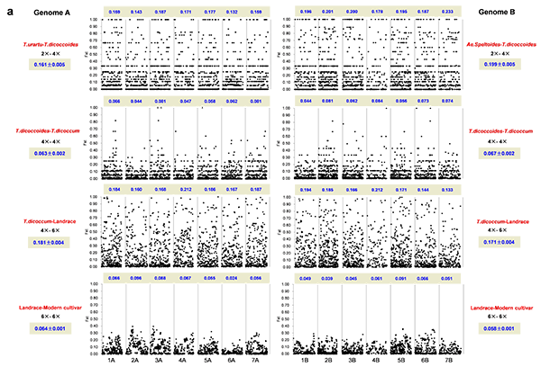 近日,中国农业科学院作物科学研究所作物基因资源发掘与利用创新团队在《科学报告》(Scientific Reports)杂志上发表了题为“The iSelect 9K SNP analysis revealed polyploidization induced revolutionary changes and intense human selection causing strong haplotype blocks in wheat”的研究论文,发现两次多倍体化导致小麦基因在新物种和供体种之间发生革命性或颠覆性分化,驯化和育种选择导致推广品种中多样性很低的单元型区段(Haplotype Block)的形成,但几乎所有染色体两端的多样性显著提高。