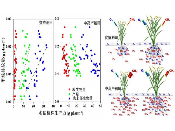 事实上,水稻高产新品种不仅可以通过根系分泌物和凋落物的形式为稻田 CH4 产生菌提供更多的碳源,促进 CH4 产生过程;但同时还可以通过强大的通气组织(根系)为稻田 CH4 氧化菌提供更多的氧气,促进 CH4 氧化过程。当土壤贫瘠时,CH4 产生的碳源主要来自当季光合产物,高产品种可以显著提高 CH4 产生进而增加排放。当土壤比较肥沃时,土壤有机碳源充足,但氧气不足,高产品种根际泌氧强,可以促进 CH4 氧化进而减少排放。可见,水稻品种对稻田 CH4 排放的调控,是通过植株影响土壤碳源和氧源及微生物群落状况,是一个地上地下的互作过程。