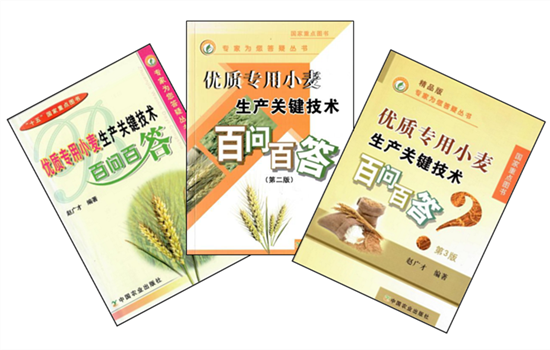 赵广才研究员带领团队历时15年,在我国10个小麦生态区开展生产需求调研,范围涉及100余个典型县、500余名科技人员、1000余个示范户、种粮大户和种麦农民,精心创作了《优质专用小麦生产关键技术百问百答》系列科普图书。该套作品包括三个版本的《优质专用小麦生产关键技术百问百答》(2005年第1版、2009年第2版、2013年第3版)及其精简版《小麦优质高效栽培答疑》。通过设问设答的方式,图、表、公式配合文字表述,提升了作品的可读性和易读性;采用结构模块化设计,系统介绍了小麦的基础知识与实用技术,包括小麦的基本知识,小麦品质概念及其与栽培措施的关系,小麦高产优质实用栽培技术,麦田常见病虫草害防治技术,麦田调查记载和测定方法,主要高产优质新品种及其栽培技术要点等内容,主要针对基层技术人员及种麦农民,便于不同层面优质专用小麦生产从业者参考对照,进行技术操作和田间管理。