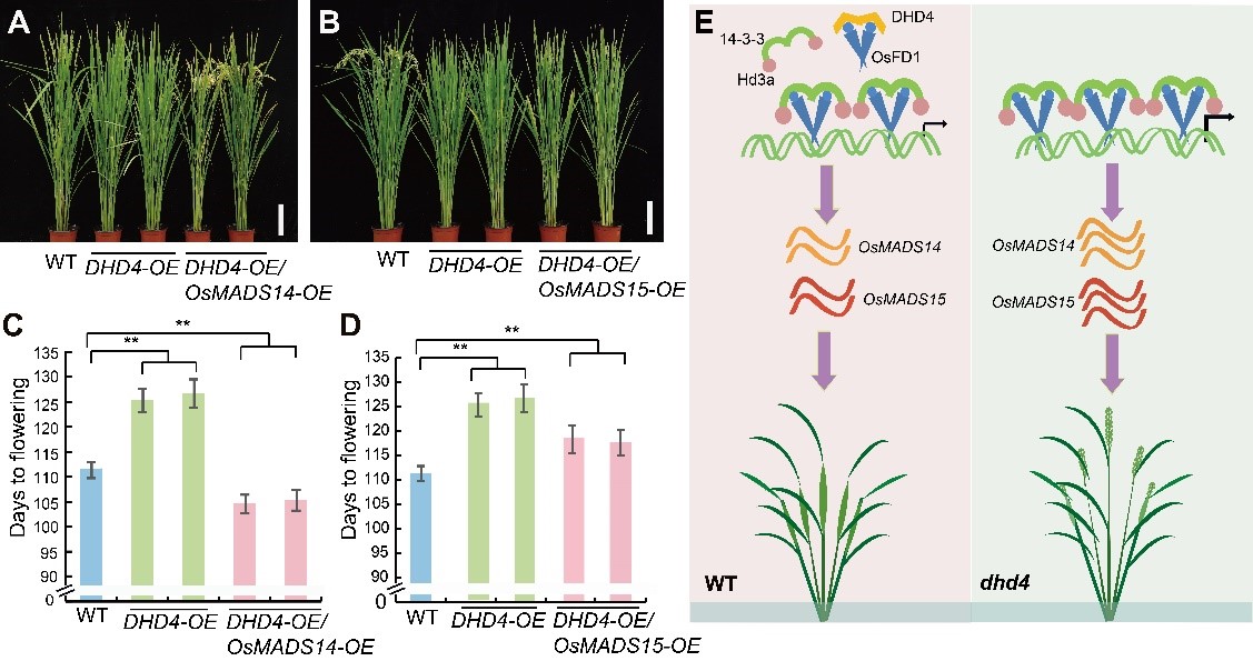 该团队研究人员克隆了一个新的抽穗期微效抑制因子DHD4。研究发现DHD4通过与抽穗期调控蛋白OsFD1的互作,影响成花素激活复合体(FAC复合物)的形成,进而导致开花基因 Os MADS14 、 Os MADS15 的表达降低,最终延迟水稻抽穗期。该研究揭示了水稻抽穗期调控的新机制,对指导水稻抽穗期精细调控的分子育种和生产实践具有重要意义。