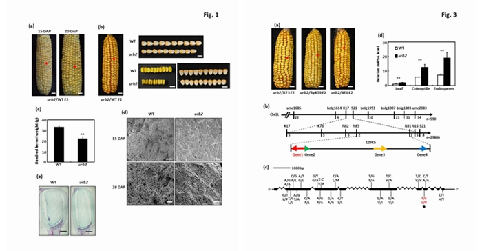 研究人员通过筛选田间育种材料中的自然突变体,发现一份在穗部明显发生籽粒大小分离的材料;将突变体作为供体亲本,与自交系B73构建了BC1分离群体;通过图位克隆,初步证实玉米 Urb2 基因( ZmUrb2 )为控制籽粒发育性状的目标基因;通过构建CRISPR/Cas9基因敲除载体对候选基因进行等位验证,进一步验证了候选基因的准确性。然后通过蔗糖密度梯度超速离心、Northern Blot和Circular RT-PCR等方法进一步解析 ZmUrb2 的作用机制,证实了在玉米中同时存在类似于小鼠和人类等多细胞动物与类似于酵母的pre-rRNA加工路径, Urb2 主要通过影响核糖体的生物合成和pre-rRNA的加工来影响籽粒发育和整个营养生长过程;此外,单倍型分析表明 ZmUrb2 基因可能在玉米从热带到温带的驯化过程中被人工选择。