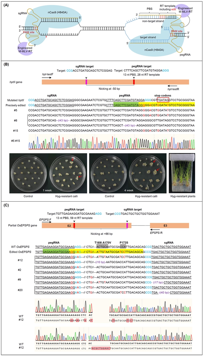 图:植物引导编辑系统对外源 hptII 突变基因和内源EPSPS基因的精准编辑