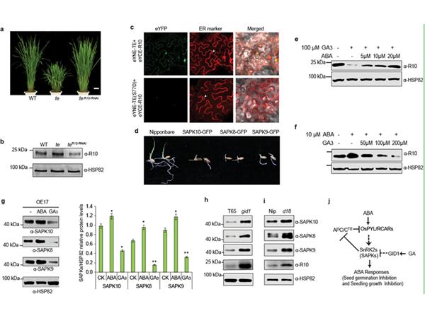 在之前的一项研究中,作物功能基因组研究创新团队发现水稻Tiller Enhancer (TE)基因编码APC/CTE E3泛素连接酶复合体的激活子,TE通过介导水稻株型和分蘖数的主控因子MOC1的降解,从而抑制水稻分蘖。另外,他们也发现te突变体还表现出矮化、剑叶和穗扭曲等表型,暗示TE可能参与调控水稻其它发育进程。本研究中他们发现,功能缺失性突变体te对ABA过敏而对GA敏感性下降。TE与ABA受体OsPYL/RCARs发生物理互作,并通过蛋白酶体途径促进后者的降解。遗传分析结果显示,OsPYL/RCARs位于TE下游。ABA通过激活SnRK2s使TE磷酸化来抑制APC/CTE活性,磷酸化的TE和OsPYL/RCARs之间的互作减弱,进而稳定OsPYL/RCARs蛋白。与之相反,GA可以降低SnRK2s活性,进而促进APC/CTE介导的OsPYL/RCARs降解。这些结果暗示SnRK2-APC/CTE调控模块是植物中GA和ABA拮抗作用的一个重要调控节点。