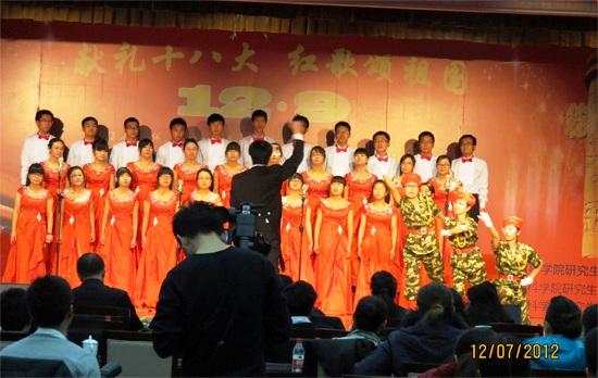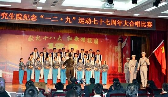 为纪念“一二·九”爱国运动七十七周年,继承和发扬革命先辈的爱国热情和民族精神。12月7日晚上,我院研究生院组织举办了主题为“献礼十八大,红歌颂祖国”的 “一二·九”大合唱比赛。我所2012级研究生所在的硕士1班,硕士2班和博士1班,以整洁统一的服装,高亢嘹亮的歌声,蓬勃向上的朝气亮相比赛。
