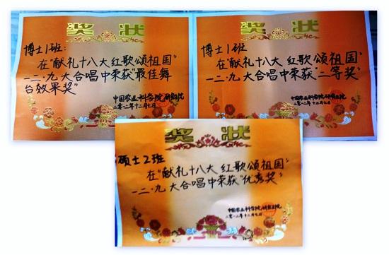 在《走向复兴》嘹亮歌声中唱出了硕士1班的风采。雄浑激昂的《保卫黄河》,展现了硕士2班意气风发,热情高涨的精神风貌。博士1班的一首《十送红军》,配以惟妙惟肖的场景表演让音乐和情景浑然一体,给观众留下了深刻印象。最后,2012级博士1班在此次比赛中获得了二等奖和最佳舞台效果奖,硕士2班取得了优秀奖的好成绩。本次合唱比赛不仅增强了各班班级凝聚力,同时也展现了作科所学子的锐意进取、激情盎然的风采和积极向上的精神风貌。一首首红歌唱出了同学们对祖国的热爱,大家用嘹亮的歌声唱出心中的对爱的向往,歌唱祖国美好的今天,展望祖国腾飞的明天。作物科学研究所(2012年12月11日)