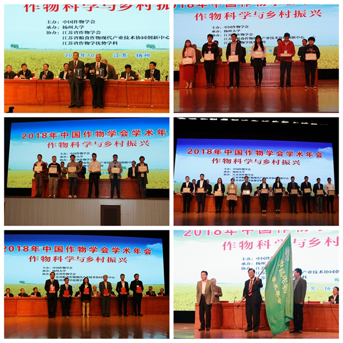 会议还宣布了授予扬州大学杨建昌教授、山东省农业科学院作物研究所刘建军研究员第七届中国作物学会科学技术成就奖;授予“京科968等玉米新品种选育及大面积推广”、“高抗优质超级稻恢复系雅恢2115的创制与应用”和“大豆花叶病毒病鉴定体系创建和抗病品种选育及应用” 3个项目2018年度中国作物学会作物科技奖;授予四川农业大学玉米遗传育种创新团队“2018年度中国作物学会作物科技奖—创新团队奖”;授予“《小麦高产创建》及系列模式图”、“中国小杂粮生产技术普及与推广”2个项目“2018年度中国作物学会作物科技奖—科普奖”;授予王茂军、刘兵、赵冬生、周晓钢、孟德璇、张丹凤、张夏香、翟胜男、杨晴晴、任佰朝、靳云凯11人的博士论文“2018年中国作物学会优秀博士论文奖”。会议评选出研究生论坛优秀学术报告奖6项、优秀墙报奖6项,并颁发了荣誉证书。