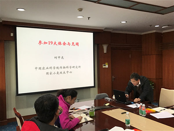 十九大代表何中虎同志结合十九大谈了自己的见闻和体会。作为一线代表,深感自豪和荣幸。他表示十九大的历史地位前所未有,开放程度前所未有,对农业的重视前所未有。要按照中共中央关于认真学习宣传贯彻党的十九大精神要求,切实履行好代表职责,加强向一线人员宣传。在工作中发挥先锋模范带头作用。要更加谦虚谨慎,更加严格要求自己,在培养青年人才、新品种推广、基因组学等新技术应用方面做出应有的科学贡献,以更高标准,再创一流业绩。