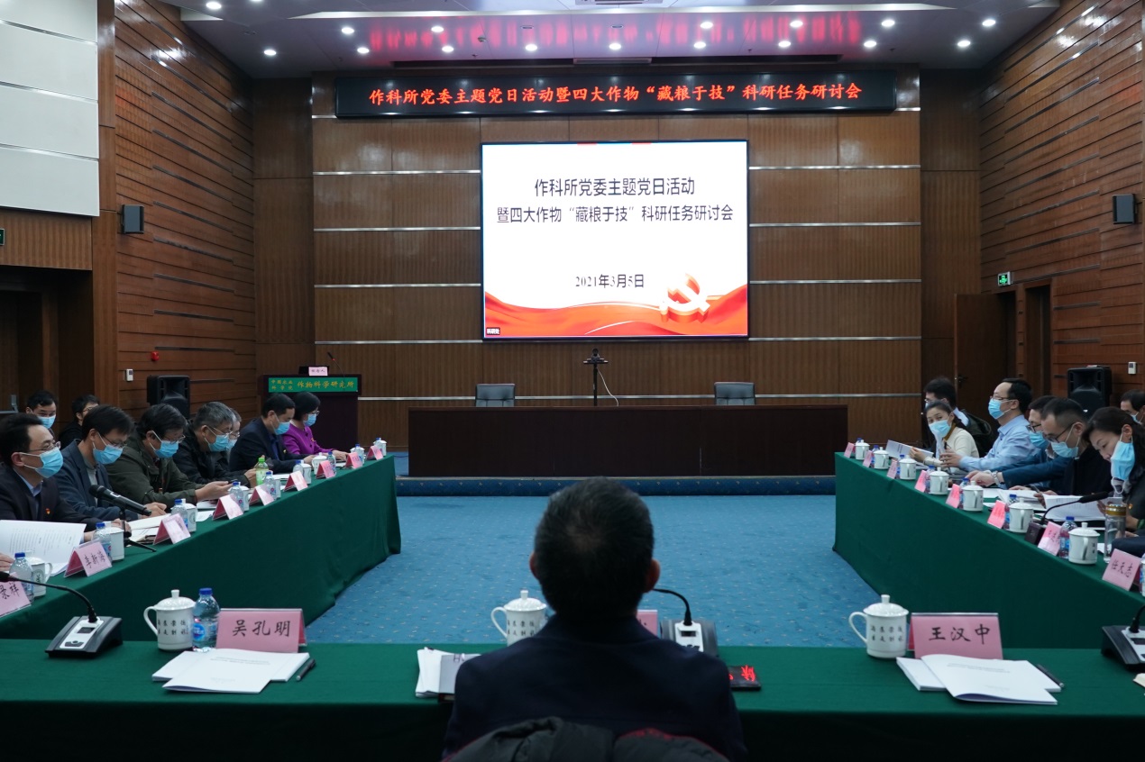 3月5日,中国农业科学院党组书记张合成出席作物科学研究所党委组织的“落实藏粮于技战略,打好种业翻身仗”主题党日活动,带领党员、专家共同学习了习近平总书记在中央经济工作会议和中央农村工作会议上关于粮食安全和打好种业翻身仗的重要指示精神,以及中央巡视组对中国农科院巡视整改的要求。活动旨在推进党建与重点业务工作深度融合,集中力量打好种业翻身仗。吴孔明院士、王汉中院士、钱前院士、胡培松院士出席会议。