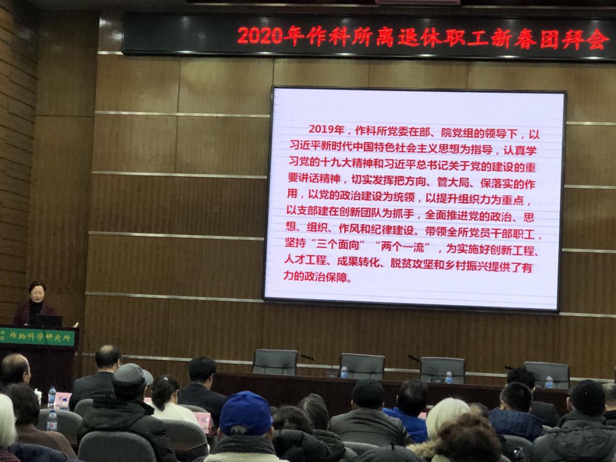 刘所长以“数说2019”开篇,向离退休老同志汇报了研究所2019年科研立项与重要成果产出、科技创新主要进展、人才队伍建设、科研条件建设、学术交流、管理机制等工作。他指出,作科所连续第八年获得研究所评价发展实力排名第一的好成绩与老同志的支持和优良传承是分不开的,离退休老同志是作科所宝贵的财富,他们的奋斗精神将激励在职职工继续努力,永攀高峰。范静书记重点汇报了研究所2019年党建工作、脱贫攻坚、精神文明建设以及党风廉政方面的情况。最后,刘春明和范静携各部门和研究中心负责人给全体离退休职工拜年,祝大家新年快乐,身体健康,万事如意!