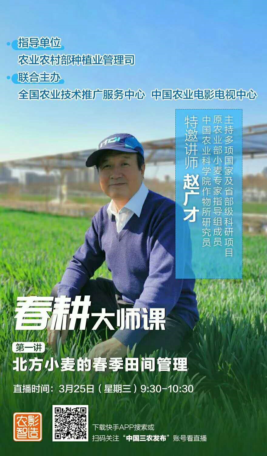 3月25日,作科所作物栽培与耕作中心小麦栽培专家赵广才研究员应邀在快手直播“中国三农发布”《春耕大师课》节目讲解北方小麦春季田间管理,授课效果显著,得到全国各地公众的点赞和转发,在线听课人数达4508人。