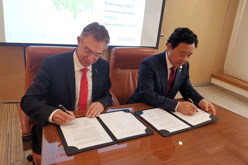3月16日,农业农村部副部长屈冬玉与国际玉米小麦改良中心(CIMMYT)主任Martin Kropff博士分别代表双方在墨西哥特斯科科签署了关于建立“中国农业农村部-CIMMYT玉米小麦联合实验室”的协议,联合实验室的秘书处设在中国农业科学院作物科学研究所/CIMMYT中国办事处。CIMMYT驻作科所的玉米分子育种专家参与了协议签署仪式。