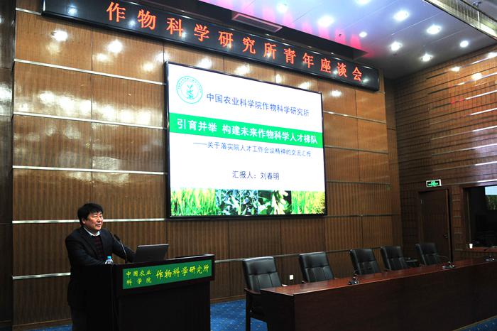 会上,刘春明首先以《引育并举 构建未来作物科学人才梯队》为题向青年职工通报了院所最新人才政策以及研究所相关改革情况。他指出,作科所秉承“科技是第一生产力、人才是第一资源、机制是第一动力”的发展理念,坚持“思想引领、人才为本、创新为要、质量为重、激励为主”的方针,不断完善“以人为核心”的人才工作链和人才工作保障体系,为“建设世界一流的研究所”提供人才支持。院人才工作会议后,作科所本着完善人才队伍结构和促进人才成长的目标,采取了一系列措施,如遴选优秀中青年课题组长,出台“二十九条”,加大对新任课题组长的支持,建立以人员当量为基础的资源配置和绩效考核办法等,不断促进大团队联合协作,建立适合革命性科研成果产出的人才培养、引进和激励机制,为研究所发展提供新的源动力。刘春明指出,下一步,作科所将推动建立人才工作长效机制。强化人才引育双轮驱动战略,加强对青年后备人才的培养,启动“中青年骨干人才”和“青年后备人才”遴选。同时,要稳步提高广大科技人员的基本岗位绩效,加大和拓宽奖励绩效的分配力度。
