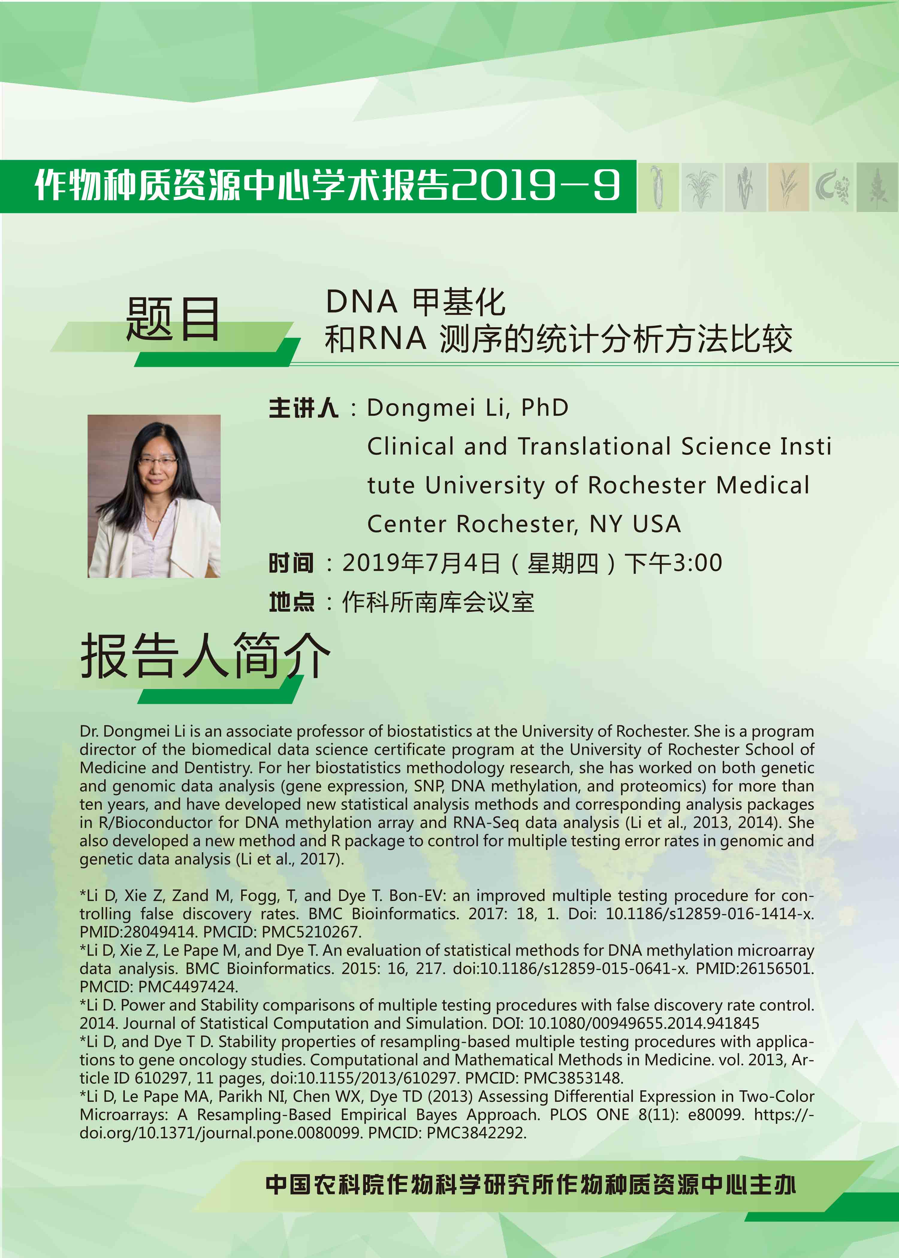 Dongmei Li, DNA甲基化和RNA测序的统计分析方法比较(作物种质资源中心学术报告2019-9)