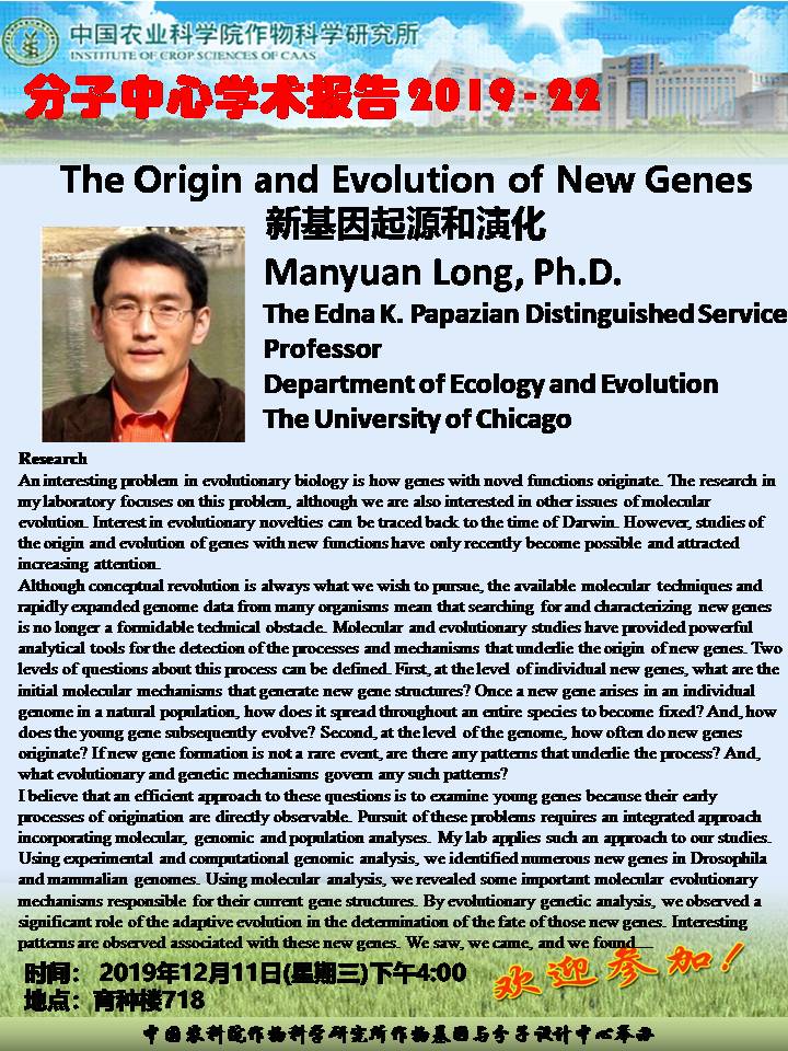 Manyuan Long, Ph.D., The Origin and Evolution of New Genes(分子中心学术报告2019-22)
