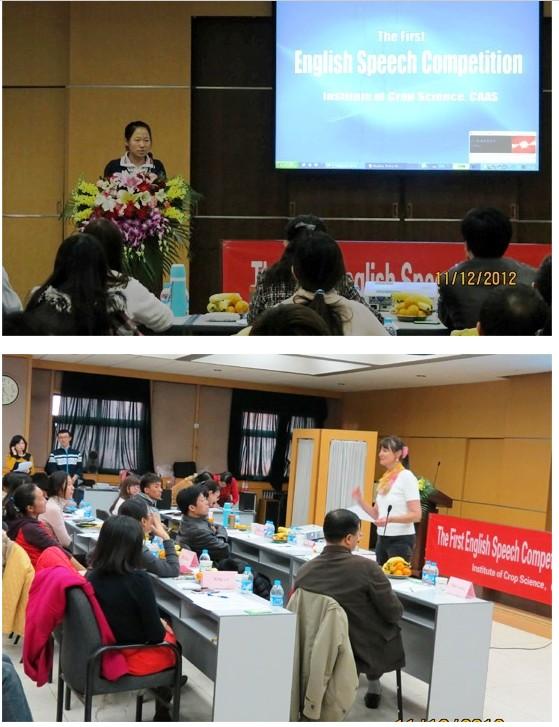 2012年11月12日下午,我所首届研究生英语演讲比赛正式拉开帷幕,共有13名研究生参加最后的角逐。作科所王述民副所长、毛龙博士、魏利青处长,国际合作局翟琳,研究生院王丽娜教授、Carol Ann Nix教授、Nang 博士担任比赛的评委。