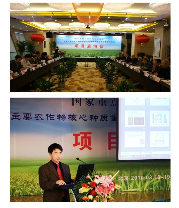 2010年3月18-19日,由中国农业科学院作物科学研究所承担的国家973计划“主要农作物核心种质重要农艺性状单元型区段及互作研究”项目启动会在北京召开。作科所王述民副所长主持开幕式,科技部钱万强副处长、农业部陈彦宾副处长、中国农科院王长江副局长、陆建中处长、作科所万建民所长、曹永生副所长等领导莅临会议并致辞。参加会议的有项目跟踪专家顾铭洪、喻子牛和施季森教授,项目顾问专家庄巧生、李振声和刘旭院士,项目专家盖钧镒、董玉琛、程顺和、陈受宜、贾继增、顾红雅和徐明良教授等,以及各课题负责人和学术骨干共计100余人。