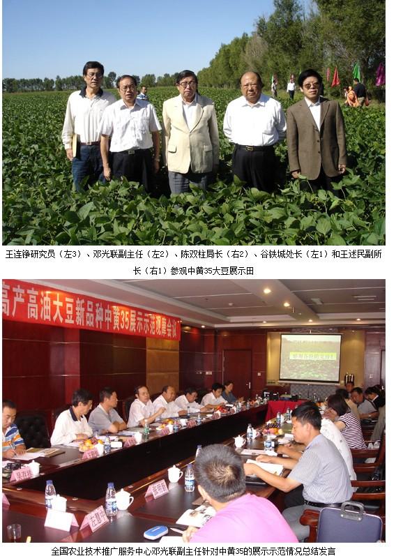 2011年9月5~6日由全国农业技术推广服务中心与中国农业科学院作物科学研究所主持的高产高油大豆新新品种中黄35展示示范观摩暨会在通辽市科左后旗召开。中国农业科学院原院长王连铮研究员、全国农业技术推广服务中心邓光联副主任和谷铁城处长、作科所王述民副所长、通辽市农牧业局陈双柱局长、内蒙古种子管理站张福宽站长、以及全国种子管理站和农技推广的农业技术人员共50多人出席了现场会和交流会。