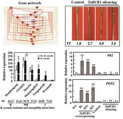 The necrotrophic fungus Rhizoctonia cerealis is the major pathogen causing sharp eyespot disease in wheat (Triticum aestivum). Nucleotide binding-leucine rich repeat (NB-LRR) proteins often mediate plant disease resistance to biotrophic pathogens. Little is known about the role of NB-LRR genes involved in wheat response to R. cerealis. In this study, a wheat NB-LRR gene, named TaRCR1, was identified in response to R. cerealis infection using Artificial Neural Network analysis based on comparative transcriptomics and its defence role was characterized. The transcriptional level of TaRCR1 was enhanced after R. cerealis inoculation and associated with the resistance level of wheat. TaRCR1 was located on wheat chromosome 3BS and encoded an NB-LRR protein that was consisting of a coiled-coil domain, an NB-ARC domain and 13 imperfect leucine rich repeats. TaRCR1 was localized in both the cytoplasm and the nucleus. Silencing of TaRCR1 impaired wheat resistance to R. cerealis, whereas TaRCR1 overexpression significantly increased the resistance in transgenic wheat. TaRCR1 regulated certain reactive oxygen species (ROS) -scavenging and production, and defence-related genes, and peroxidase activity. Furthermore, H2O2 pretreatment for 12h elevated expression levels of TaRCR1 and the above defence-related genes, whereas treatment with a peroxidase inhibitor for 12h reduced the resistance of TaRCR1-overexpressing transgenic plants and expression levels of these defence-related genes. Taken together, TaRCR1 positively contributes to defence response to R. cerealis through maintaining ROS-homeostasis and regulating the expression of defence-related genes.