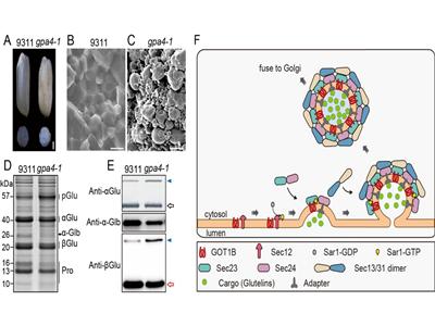 Coat protein complex II (COPII) mediates the first step of anterograde transport of newly synthesized proteins from the endoplasmic reticulum (ER) to other endomembrane compartments in eukaryotes. A group of evolutionarily conserved proteins (Sar1, Sec23, Sec24, Sec13 and Sec31) constitutes the basic COPII coat machinery; however, the details of how the COPII coat assembly is regulated remain unclear. Here, we report a protein transport mutant of rice (Oryza sativa), named glutelin precursor accumulation4 (gpa4), which accumulates 57-kDa glutelin precursors, and forms two types of ER-derived abnormal structures. GPA4 encodes an evolutionarily conserved membrane protein GOT1B (also known as Glup2), homologous to the Saccharomyces cerevisiae GOT1p. The rice GOT1B protein co-localizes with Arabidopsis thaliana Sar1b at Golgi-associated ER exit sites (ERESs) when they are co-expressed in Nicotiana benthamiana. Moreover, GOT1B physically interacts with rice Sec23 and both proteins are present in the same complex(es) with rice Sar1b. The distribution of rice Sar1 in the endomembrane system, its association with rice Sec23c and the ERES organization pattern are significantly altered in the gpa4 mutant. Taken together, our results suggest that GOT1B plays an important role in mediating COPII vesicle formation at ERESs, thus facilitating anterograde transport of secretory proteins in plant cells.