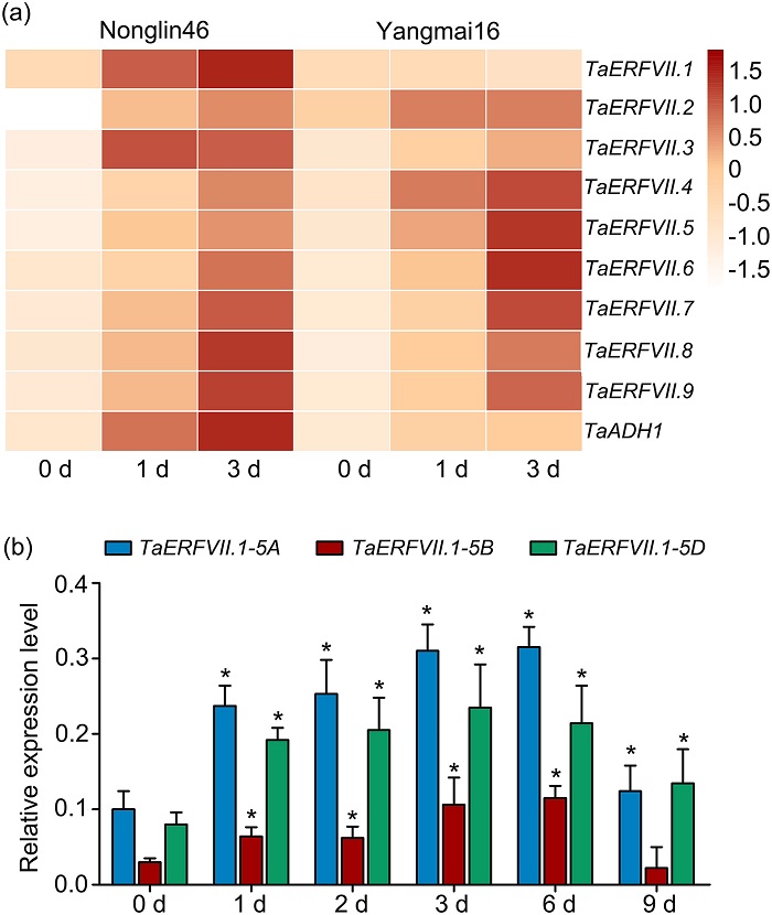 文章摘要:Waterlogging causes oxygen deprivation within plant roots and affects crop growth and yield. In crop wheat (Triticum aestivum), molecular responses to waterlogging are poorly understood. Here, we performed a genome‐wide analysis of group VII ethylene response factor (ERFVII) genes in hexaploid wheat and identified 25 genes, which were induced by waterlogging with diverse manner. Among them, TaERFVII.1 exhibited differential expression patterns between waterlogging‐tolerant wheat Nonglin46 and susceptible wheat Yangmai16 under waterlogging. Constitutive expression of TaERFVII.1 with an MYC‐peptide tag at its N terminus in wheat enhanced tolerance to waterlogging as evidenced by increased grain weight per plant, survival rate, and chlorophyll content of leaves and by increased expression of waterlogging‐responsive genes, while silencing of TaERFVII.1 compromised the expression of waterlogging‐responsive genes. Notably, constitutive expression of the stabilized TaERFVII.1 did not negatively impact both plant development and grain yield under standard conditions. We further demonstrated that constitutive expression of stabilized TaERFVII.1 elevated the transcriptional level of TaSAB18.1, the ortholog of Arabidopsis HRA1 and rice SAB18, consequently reduced the expression of waterlogging‐responsive genes under standard conditions. These results suggest that TaERFVII.1 plays an important role in wheat tolerance to waterlogging, and it could be a candidate for improving crop waterlogging tolerance.