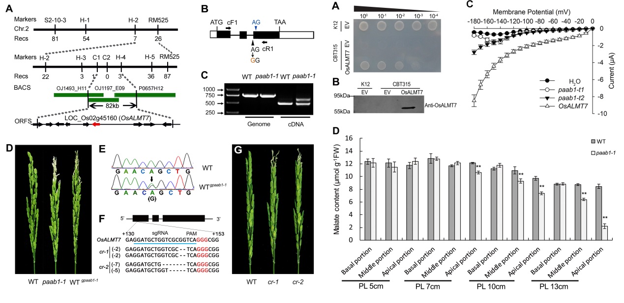 Panicle size is a critical determinant of grain yield in rice (Oryza sativa) and other grain crops. During rice growth and development, spikelet abortion often occurs at either the top or the basal part of the panicle under unfavorable conditions, causing a reduction in fertile spikelet number and thus grain yield. In this study, we report the isolation and functional characterization of a panicle abortion mutant named panicle apical abortion1-1 (paab1-1). paab1-1 exhibits degeneration of spikelets on the apical portion of panicles during late stage of panicle development. Cellular and physiological analyses revealed that the apical spikelets in the paab1-1 mutant undergo programmed cell death (PCD), accompanied by nuclear DNA fragmentation and accumulation of higher levels of H2O2 and malondialdehyde (MDA). Molecular cloning revealed that paab1-1 harbors a mutation in OsALMT7, which encodes a putative aluminum-activated malate transporter (OsALMT7) localized to the plasma membrane, and is preferentially expressed in the vascular tissues of developing panicles. Consistent with a function for OsALMT7 as a malate transporter, the panicle of the paab1-1 mutant contained less malate than wild type, particularly at the apical portions, and injection of malate into the paab1-1 panicle could alleviate the spikelet degeneration phenotype. Together, these results suggest that OsALMT7-mediated transport of malate into the apical portion of panicle is required for normal panicle development, thus highlighting a key role of malate in maintaining the sink size and grain yield in rice, and probably other grain crops.