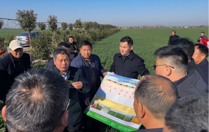 小分队调研了小麦苗情、土壤墒情及病虫害发生态势,肖永贵研究员和王永华研究员为全县种植大户详细培训了水肥管理、病虫害防治、冻害等灾害预防等关键技术要点和后期田间管理的注意事项,并发放了大面积单产提升技术模式图等。张云慧研究员就小麦生长过程中常见的病虫害症状、发生时期与防治方法进行了全面的讲解。针对当前小麦生产实际,春季田间管应以控旺长、防干旱、防冻害、防病虫草,促苗情转化升级、分蘖成穗、穗花发育为重点,立足“早”,突出“防”字,落实“细”,分区域精准把控、分类型精准施策、分阶段压茬跟进,控旺促弱稳,培育健壮个体,构建合理群体结构,搭好丰产架子。
