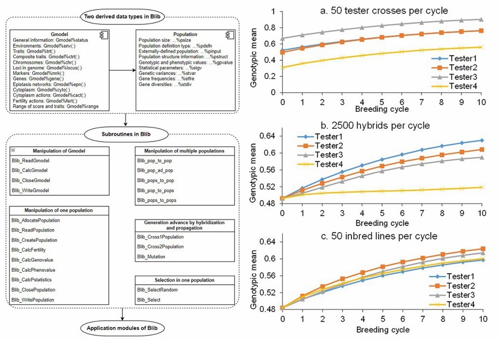 研究人员构建了一个适合于所有二倍体物种(或减数分裂行为与二倍体相似的多倍体物种)的通用计算机仿真模拟平台,称之为Blib。平台能够处理目前已知的所有遗传模型,包括细胞质信息、细胞核基因组信息、加性-显性-上位性效应模型、遗传连锁、突变、雌雄配子育性等;可以模拟产生各种类型的遗传和育种群体,包括自交群体、杂交群体、随机交配群体、无性系繁殖群体;有选择群体、无选择群体等等。基于Blib平台,开发了适宜于特定物种、特定育种方法、特定遗传现象的各种应用程序和模块,进而模拟优化遗传育种方法,对特定亲本杂交后代的表现进行预测。这些模块能够将大量的遗传信息与育种家的育种需求结合起来,供育种家在开展田间试验之前模拟预测不同的杂交和选择方案,比较不同育种方法的优劣,设计最优的育种亲本和育种方案,育种过程中获得实时决策,最终实现遗传研究、分子设计与传统育种的有机结合。Blib平台及其应用模块为即将到来的基于大数据和智能化决策的育种4.0时代提供必不可少的技术支撑。