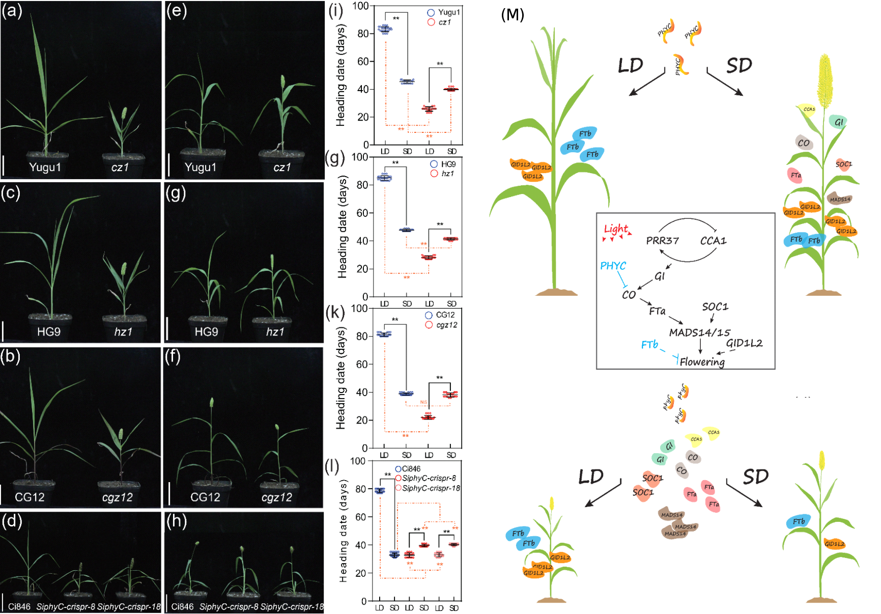 光敏色素(Phytochrome, PHY)作为光受体可以感受光信号,参与了光周期对植物的开花(抽穗期)调控。为了解析植物对光周期响应的遗传机制,该研究利用群体遗传学等研究方法,发现了SiphyC在谷子驯化过程中受到了选择,进而通过对特定不同遗传背景谷子种质资源开展早熟性谷子突变体的筛选,得到4个不同遗传背景的SiphyC等位突变体。这些突变体均表现为极早抽穗,同时伴随着分蘖增多、株高降低等表型。谷子作为短日植物,抽穗期表现为长日抑制,短日促进;但SiphyC突变体的抽穗期表现为长日促进,短日抑制,呈现完全相反的表型,说明SiPHYC的突变会使谷子具有长日植物属性。该研究结果表明,短日植物谷子的光周期响应受到SiPHYC直接调控,这一发现丰富了我们对光敏色素基因功能方面的科学认识。