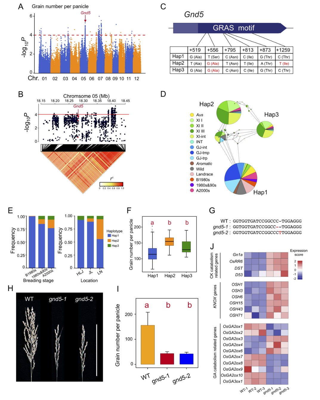 该研究对816份我国不同时期代表性粳稻品种进行了重测序,并整合已发表的5500份水稻测序数据,系统分析了不同时期主栽品种的基因组组成。研究发现,自20世纪80年代以来,来自3个不同籼稻亚群的血缘向粳稻品种中的渗入持续增加,使粳稻的重要性状发生了显著变化,如稻瘟病抗性提高、穗粒数增加、单株穗数减少、株型由多穗型向重穗大穗型转变。还发现与株型、产量和抗病虫性相关基因的等位基因由籼稻渗入到粳稻中,籼稻血缘的渗入贡献了粳稻品种中缺乏的一些优异等位基因,从基因组层面反映了我国粳稻的改良历史。另外,研究还鉴定了一个调控水稻穗粒数的新基因 Gnd5 ,与野生型相比,敲除 Gnd5 的突变体穗粒数显著减少。进一步分析发现, Gnd5 基因是渗入的靶基因,对育种具有重要的应用价值。此外,通过研究各骨干亲本系谱中穗粒数相关基因单倍型的利用模式,发现多基因的优势单倍型聚合利用存在较强的系谱背景特异性,这将有助于未来在广泛遗传背景下进行QTL聚合和育种路线优化。该研究系统分析了我国粳稻育成品种的演变规律和改良历史,为未来水稻基因组育种提供了新思路。