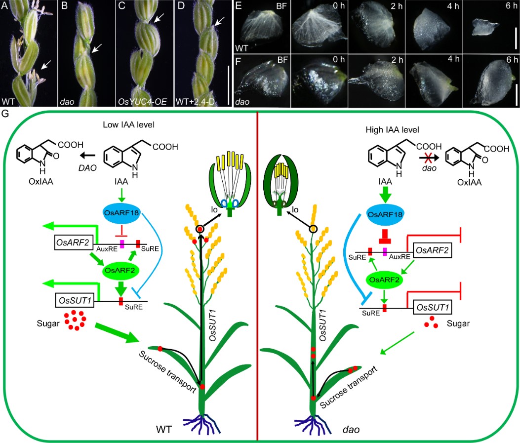 在前期研究中,该团队筛选获得了一个水稻生长素氧化双加氧酶失活的dao 突变体,该突变体不能将活性状态的生长素(IAA)失活,破坏了体内IAA的动态平衡,导致单性结实。进一步研究发现,dao 突变体叶片中蔗糖含量增加,但花器官(浆片、花药和子房)中的蔗糖含量却显著降低。测序分析显示,在dao突变体浆片中生长素转录因子OsARF18表达上调,而OsARF2表达下调。OsARF18的过表达系或OsARF2敲除系均能够再现 dao 突变体的表型。实验证明, OsARF2 通过直接结合 OsSUT1 启动子中的糖响应元件调节其表达,而 OsARF18 则通过直接结合生长素反应元件或糖响应元件抑制 OsARF2 和 OsSUT1 表达,从而调控蔗糖从源到库的运输。而在 dao 和 Osarf2 突变体中过表达 OsSUT1基因,能显著提高突变体颖花张开率和小穗结实率。这些研究结果揭示了生长素信号级联反应调控蔗糖转运子表达,调节蔗糖从源(叶片)到库(浆片、花药和子房)的分配,进而影响水稻颖壳张开、花药开裂和籽粒灌浆结实的分子机制,为通过协调源-库-流分配提高农作物产量提供了重要理论依据。