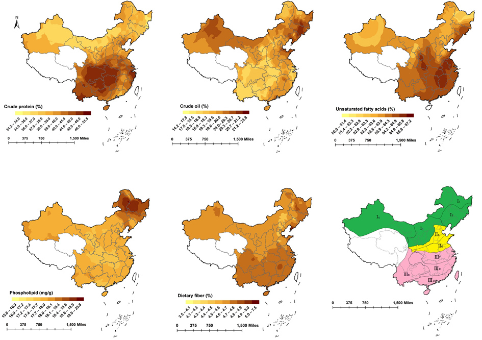 为了阐明大豆品质的地理分布特征,研究团队依托国家大豆产业技术体系30个综合试验站及150个科技示范县,从中国29省(市、区)的大豆生产田收集样品1792份,对蛋白质、脂肪、脂肪酸、功能性成分、抗营养因子等共计33种营养品质性状进行了定量理化分析,并完成不同营养成分的可视化地理分布图。研究表明,我国大豆籽粒中粗蛋白、可溶性蛋白和不饱和脂肪酸含量呈现出明显的由北向南递增趋势;粗脂肪(高寒地区例外)、磷脂、皂苷、类胡萝卜素、露那辛含量呈现出明显的递减趋势;寡聚糖、异黄酮、生育酚含量高的大豆呈点片状分布。