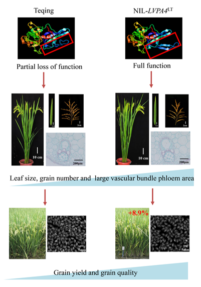 研究人员克隆到了一个控制水稻穗颈大维管束韧皮部面积性状的基因LVPA4,该基因与窄叶基因NAL1等位。该基因的突变体与其对照植株相比,显著增加了穗颈大维管束韧皮部面积(约12.7%)、每穗总粒数(约17.2%)、每穗实粒数(约22.5%)、剑叶面积、叶面积指数以及抽穗期茎鞘非结构性碳水化合物的含量,导致源、库、流性状的协同提高。试验表明,该突变体在小区试验中稻谷产量增幅7.6~9.6%,同时源中光合作用的产物包括前期贮存在茎秆中的非结构碳水化合物通过流性状充分运送到籽粒中,籽粒特别是穗基部的籽粒充实度好,从而改善了稻米品质。该研究表明LVPA4单个基因通过源、库、流性状的协调作用,同时提高了水稻产量和稻米品质,在水稻高产优质育种中具有应用价值。