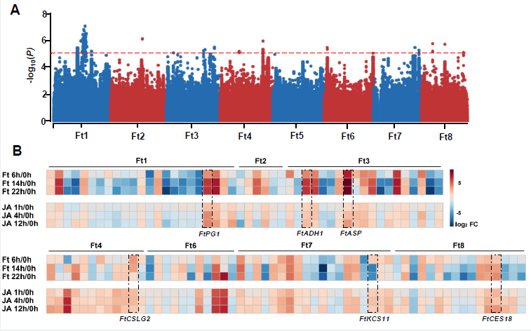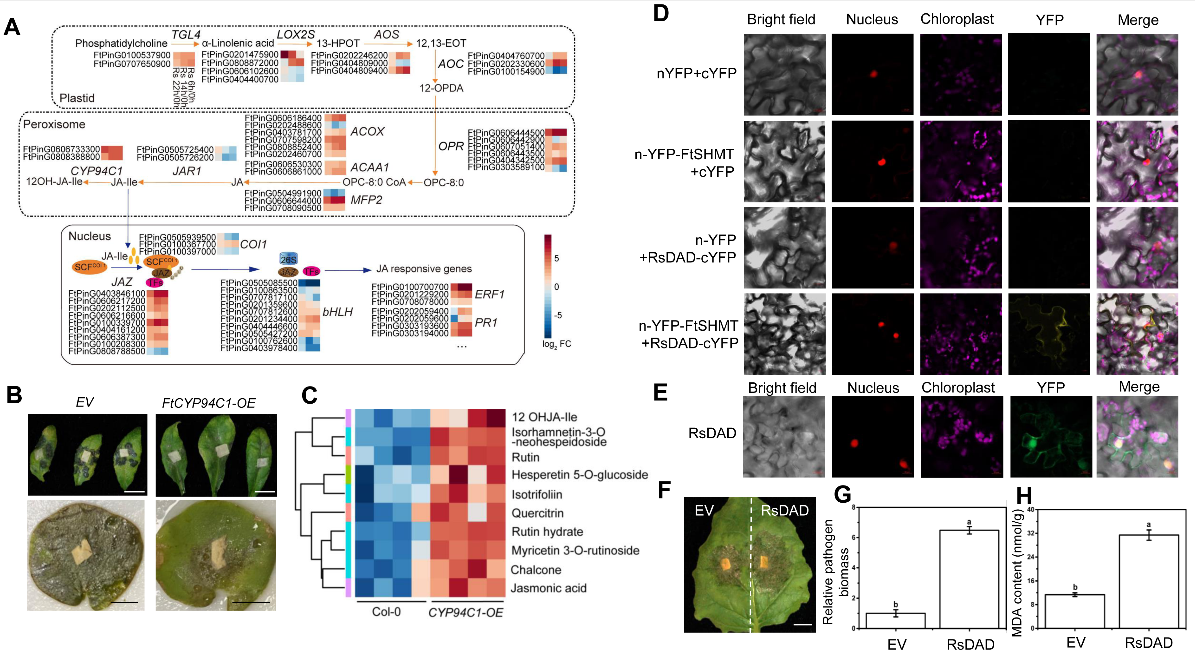 研究团队通过对苦荞核心种质资源进行抗病性检测,结合全基因组重测序数据研究,鉴定出106个同时与黄酮类物质代谢和抗病性密切相关的驯化位点。实验发现,许多苦荞茉莉酸合成信号通路的关键基因受立枯丝核菌侵染后显著差异表达。对该信号通路关键酶基因FtCYP94C1过表达,发现黄酮类物质芦丁的含量显著提高,且植株对立枯丝核菌的抗病性提高。研究还发现参与黄酮类物质代谢的丝氨酸羟甲基转移酶受茉莉酸信号诱导,且与立枯丝核菌毒力蛋白互作,促进植物感病。该研究揭示了立枯丝核菌与苦荞互作的分子机制,为荞麦抗病分子育种提供了重要的基因资源。