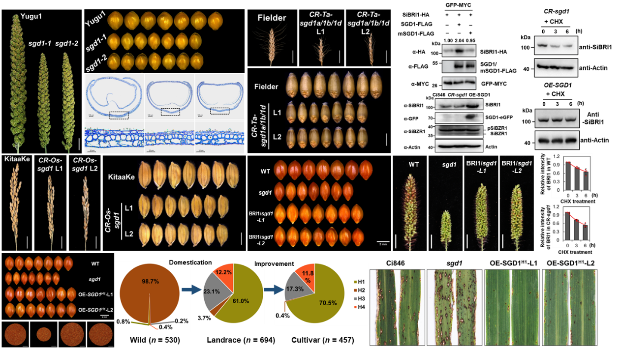 该团队利用谷子豫谷1号EMS突变体库鉴定产量相关性状的突变体,发掘到谷子籽粒产量调控的重要基因资源 SGD1 ,该基因编码一个泛素连接酶,能够通过调节植物细胞大小,影响谷子的株高、粒重和株型等多个关键农艺性状。研究表明, SGD1 编码的泛素连接酶能够与谷子泛素结合酶以及油菜素内酯信号受体互作,进而增强了油菜素内酯信号的稳定性,促进多个基因共同作用调控作物的产量和抗性。通过对1681份谷子种质资源中 SGD1 基因的单倍型分析及相关实验发现,该基因的优异单倍型,能够显著提高谷子单株产量及谷瘟病抗性。进一步研究表明, SGD1 在水稻、小麦和玉米等禾谷类作物中具有保守的调控作物籽粒产量的功能。因此,解析和利用该基因资源,对提高禾谷类作物产量,保障国家粮食安全具有重要意义。